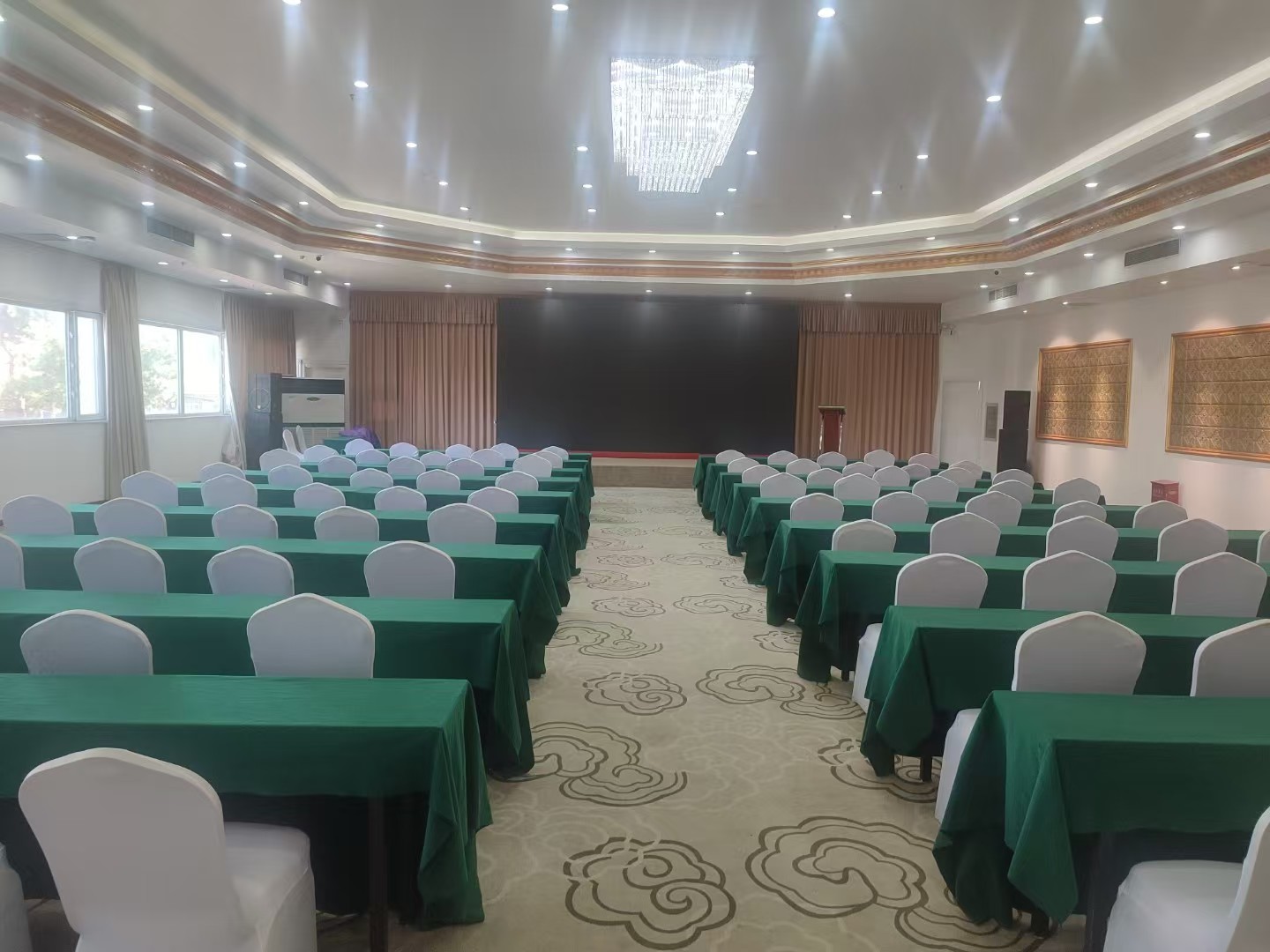 在会议厅内面向讲台摆放一排排座椅,中间留有较宽的过道。